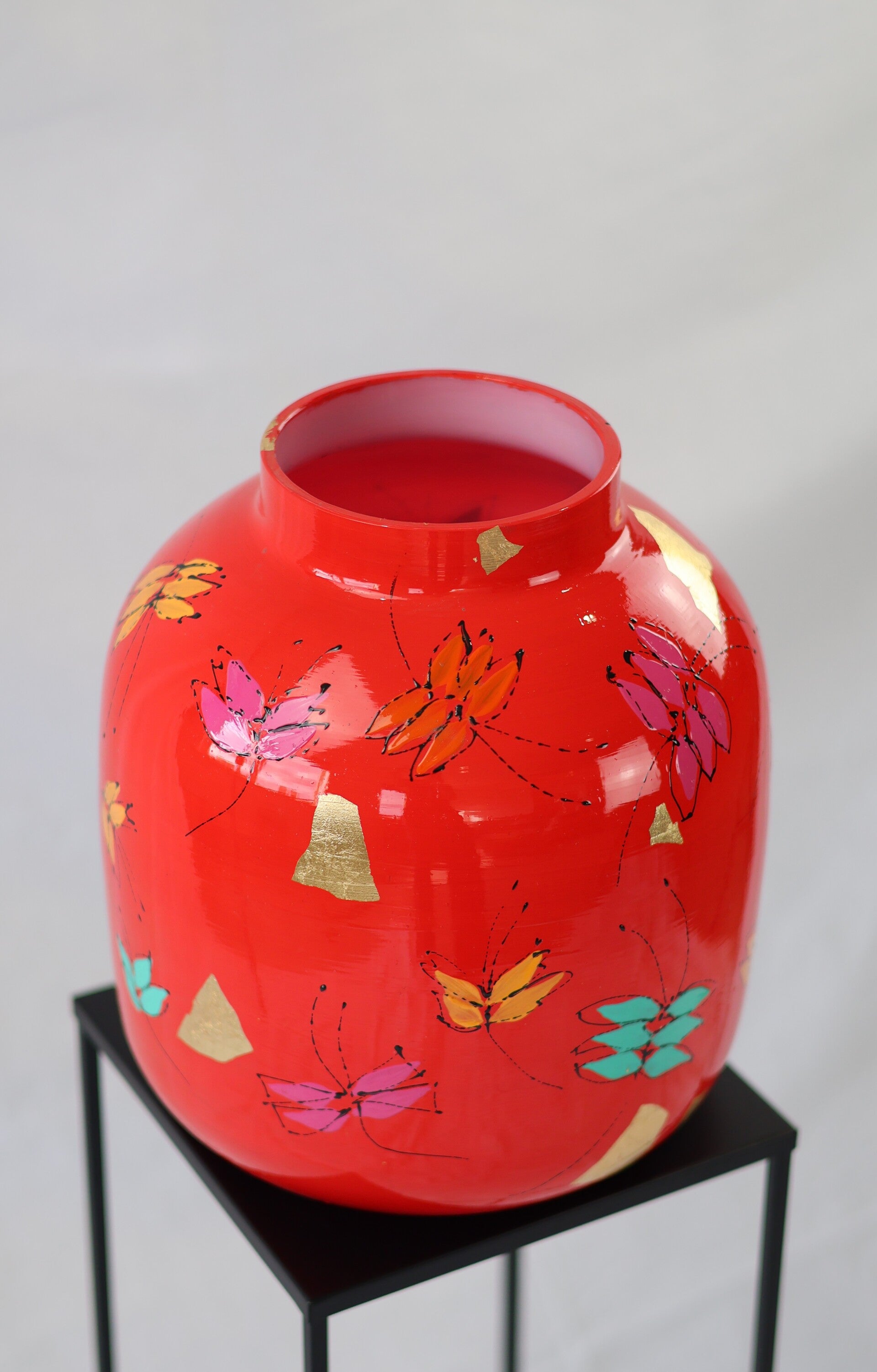 Deze rode vaas met vlinders springt meteen in het oog. De combinatie van de warme kleur en de vrolijke vlinders geeft haar een speelse uitstraling.